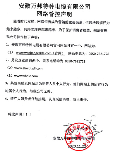 鄭重聲明:安徽萬邦特種電纜有限公司官方網站為:www_wanbangcable_com.guangzizai.com,除此之外無任何子網站或合作網站,其余均為假冒偽劣。電話:0550-7621728 13485756353 地 址:安徽省天長市滁州高新技術產業開發區經四路29號